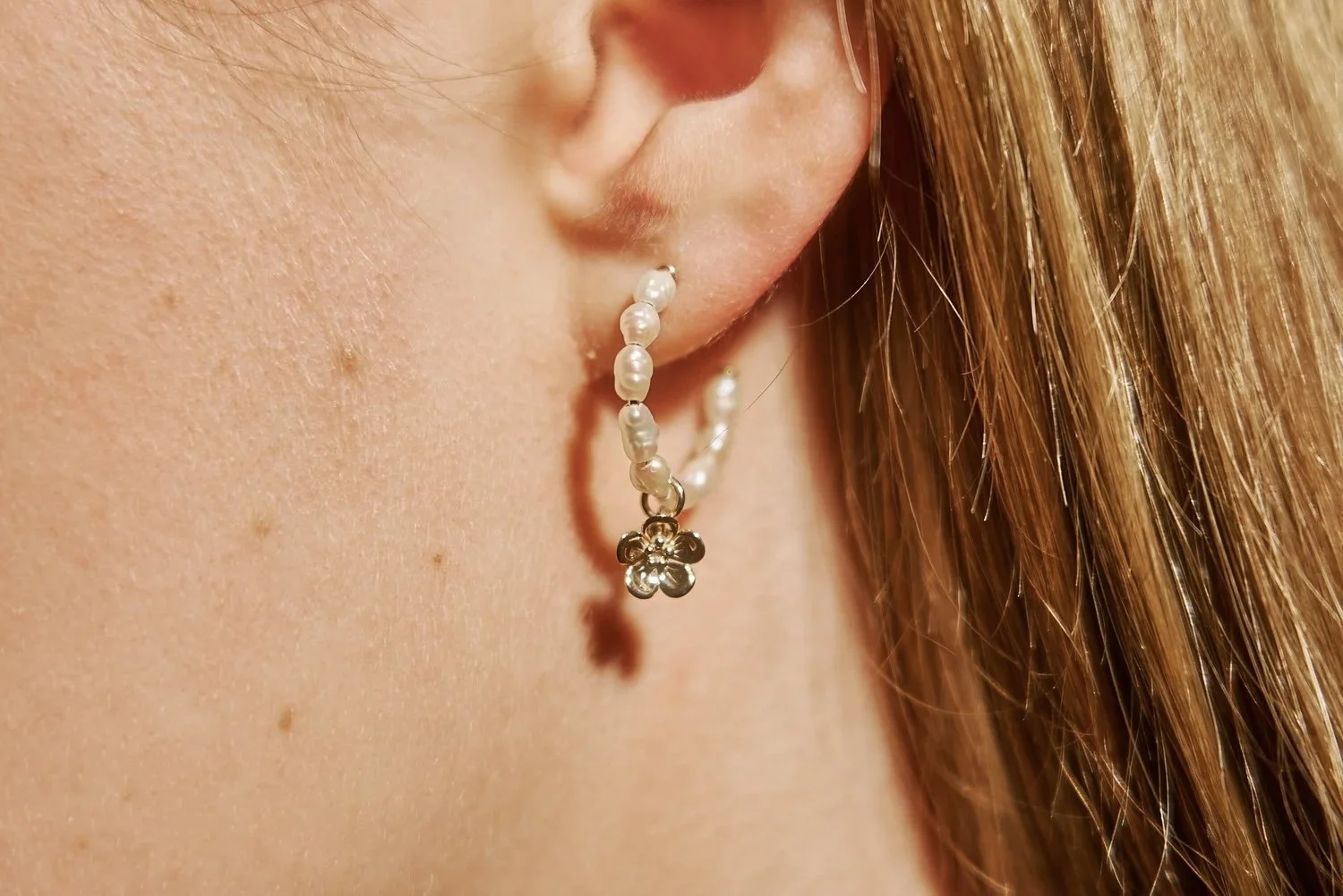 The hoops are formed from small irregular freshwater pearls, creating an organic texture and soft lustre around the ear. Each earring features a hand-fabricated 9ct gold forget-me-not flower charm measuring approximately 8mm in diameter. The hoop measures approximately 20mm in diameter and is supplied with 9ct gold scroll-style backs for secure wear.